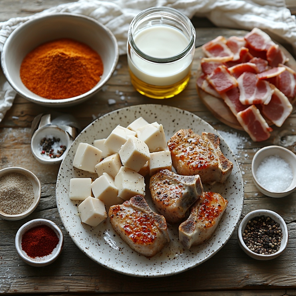 Gathering the ingredients for this recipe is as straightforward as the cooking itself. Each item plays a vital role: the pork chops provide hearty substance, seasonings add layers of flavor, and the bacon brings that irresistible smoky richness to the gravy—everything blends harmoniously to create a soul-soothing classic.
